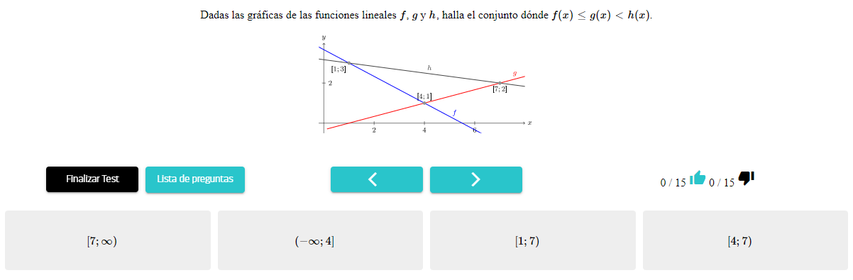 Si no quieres seguir respondiendo o si has resuelto todos los ejercicios, haz click en "Finalizar test" y aparecerá la evaluación del test. Incluso después de finalizar el test puedes pasar por todas las preguntas y comprobar las respuestas correctas. Haciendo click en el botón "Temas" del menú puedes volver a la página principal de Math4S e iniciar otro test.