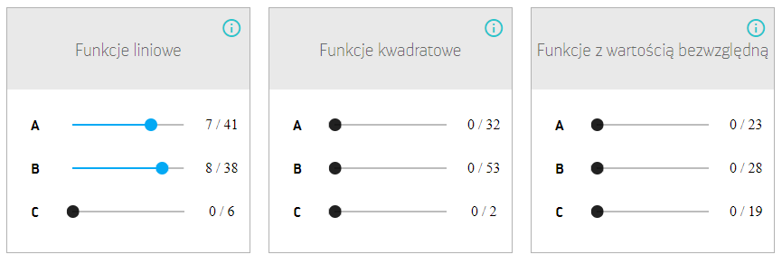 Suwakiem przy każdej części w każdym podobszarze możesz sobie wybrać, ile chcesz pytań. Po prawej stronie od suwaka widisz dwie liszby. Pierwsza Cię informuje, ile wybrałeś pytań z danej części i podobszaru (przy wstępie na stronę nie jest wybrane żadne pytanie i dla tego jest tam zero). Druga liczba Ci mówi, ile pytań jest całkowicie do dyspozycji dla danego podobszaru i części.