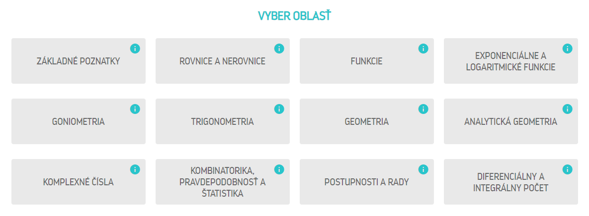 U každej podoblasti je znova tlačítko „i“, pomocou ktorého sa dozvieš, aké typy otázok patria do každej časti.