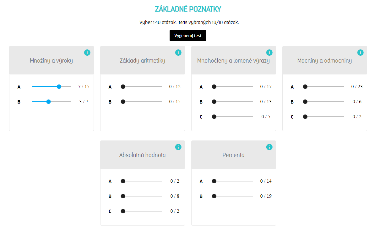 Posúvaním pri každej časti si vybereš počet otázok daného zamerania. Vpravo vedľa posúvania sú dve čísla. Prvá ťa informuje, koľko máš vybratých otázok z tejto časti a podoblasti (po vstupe na stránku nieje nikde vybratá žiadna otázka a preto je tam nula). Druhé znamená celkový počet otázok, ktoré sú k dispozíci pre túto podoblasť a časť.